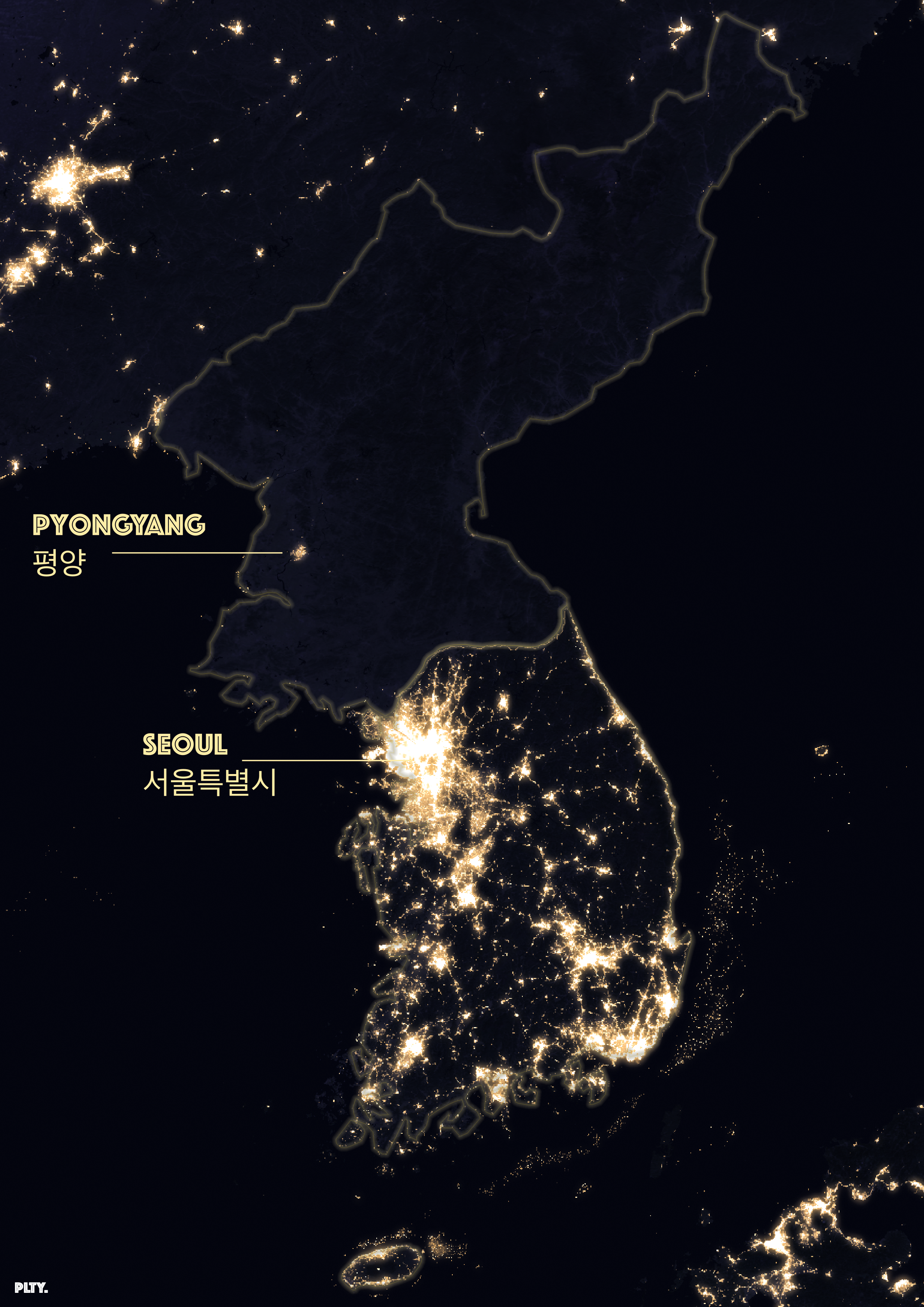 Data from Earth at Night (NASA). I wanted to showcase the difference in South (urban) and North Korea (rural) and it is quite stark.