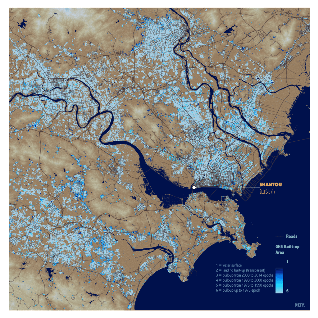 Used the built-up presence Landsat multi-temporal dataset to make these maps. I wanted to focus on Hong Kong/Guangzhou but I downloaded the wrong location for DEM (from JAXA) so I just went with what I had!